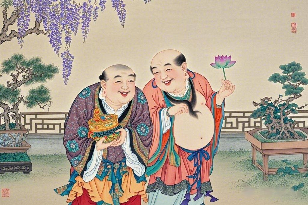 相传,和合二仙是唐朝两位高僧寒山、拾得的化身,他们已完全脱离了落發人的身份和模样,被民间革新成为和合共欢的婚姻祥瑞神。